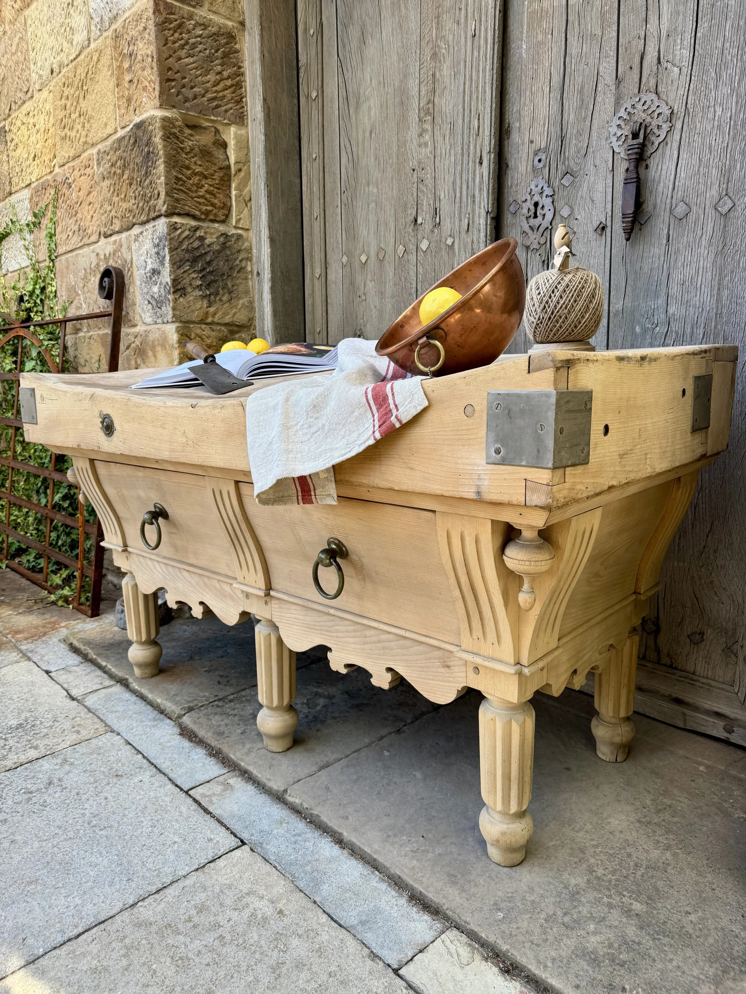 AF9586 19th Century French butchers block with two large drawers to the front,,,knife slots to the back,beautiful shaped legs and apron mildly worn usable top 149cm long 68,5cm deep 85cm high at back $3895
