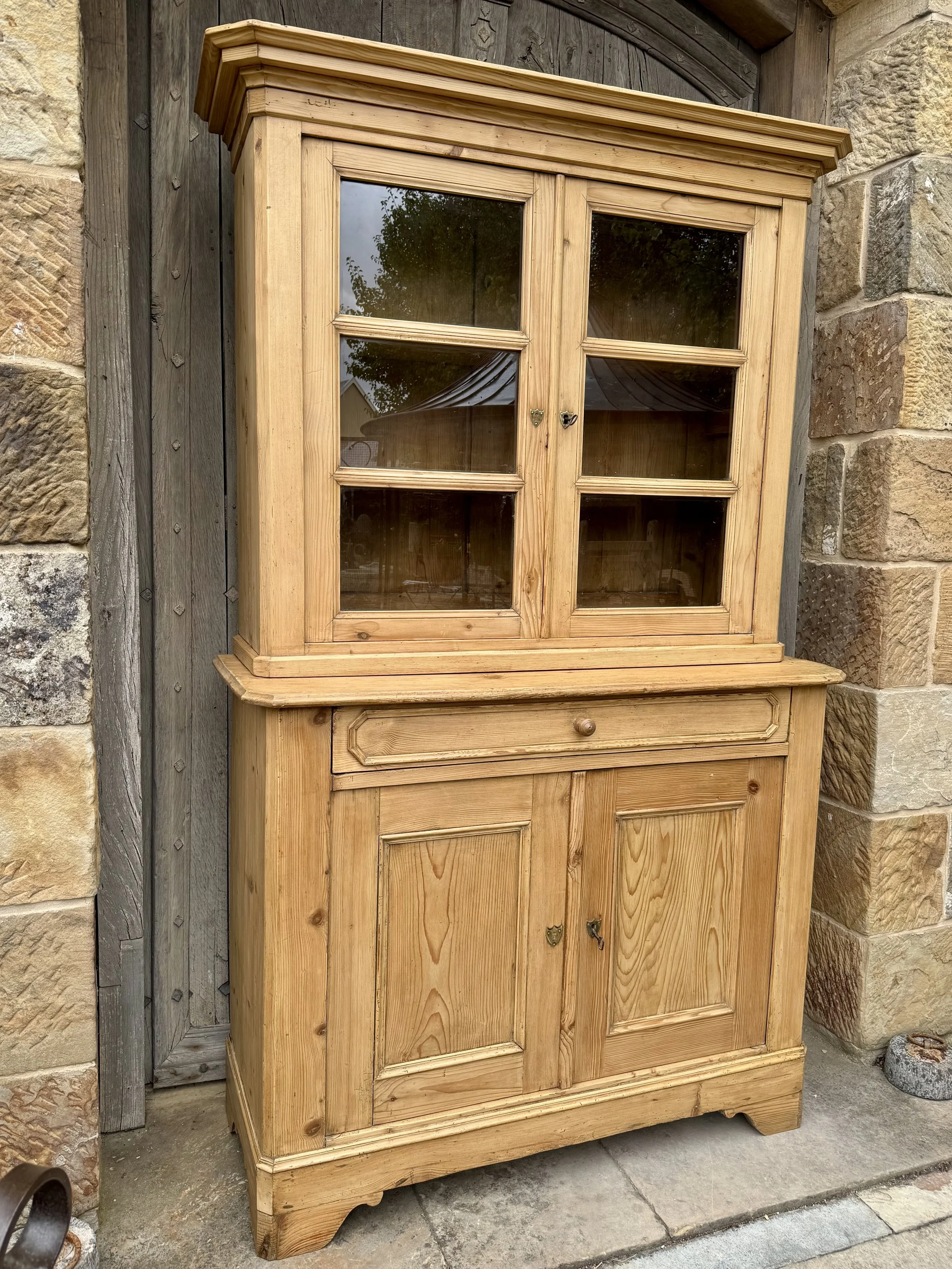 AF 19th century Danish country pine vitrine with double glass opening doors to top above a large single drawer and closed doors to base 131cm ling 52cm deep 218 high $2850