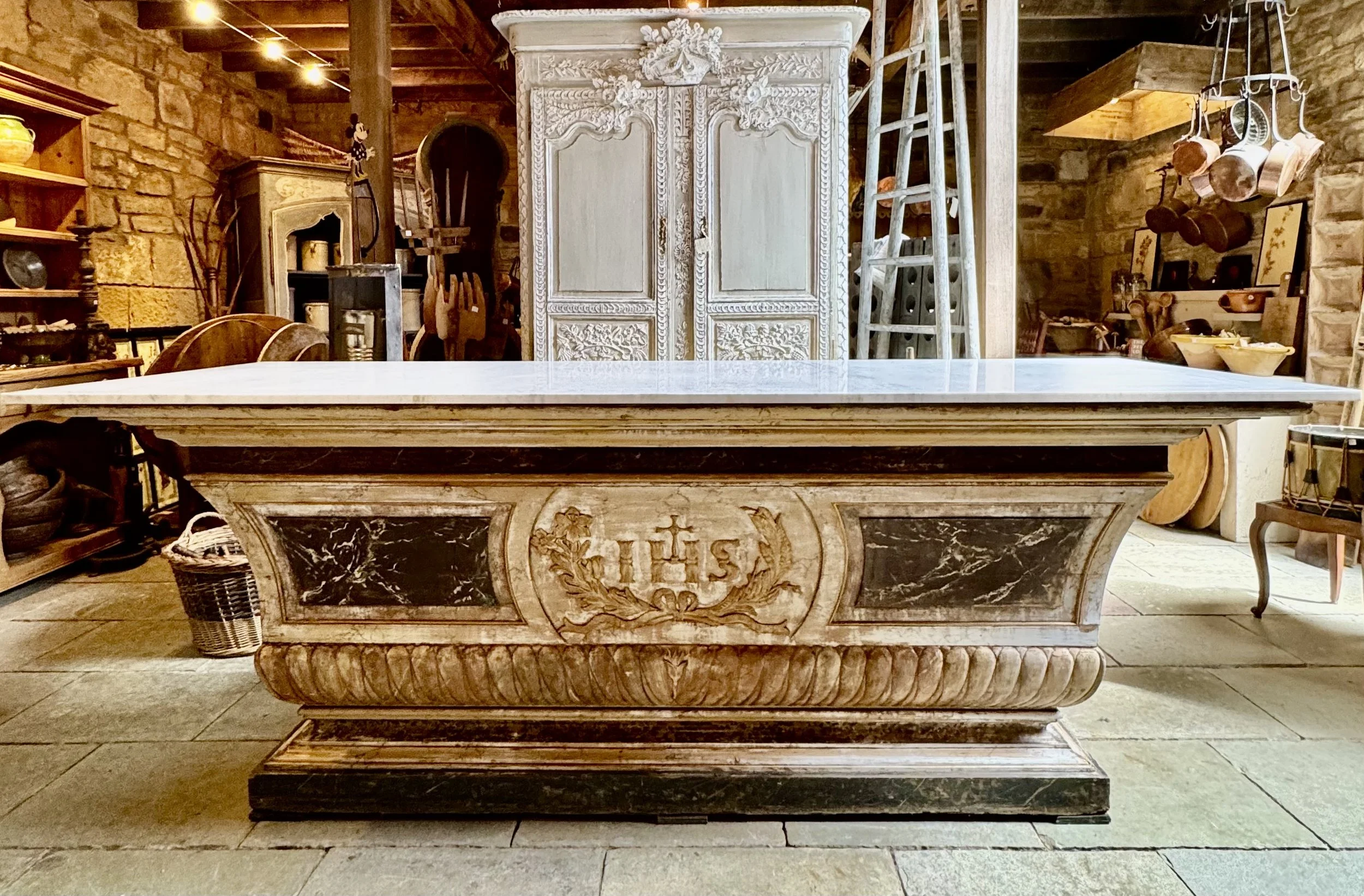 AF Magnificent 18th century Italian Altar console with original paint and beautiful Carrara marble top $12000